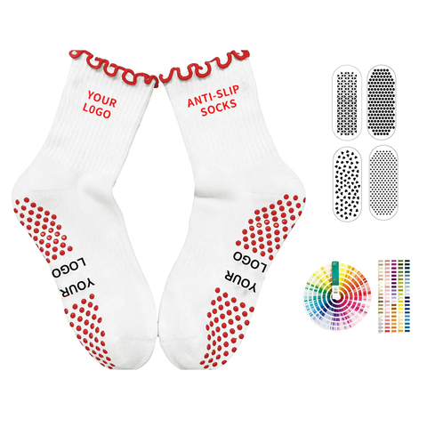 2025 Calcetines antideslizantes de algodón fino para mujer con logotipo personalizado Pilates con logotipo bordado Crew High antideslizante Yoga Ruffle Design